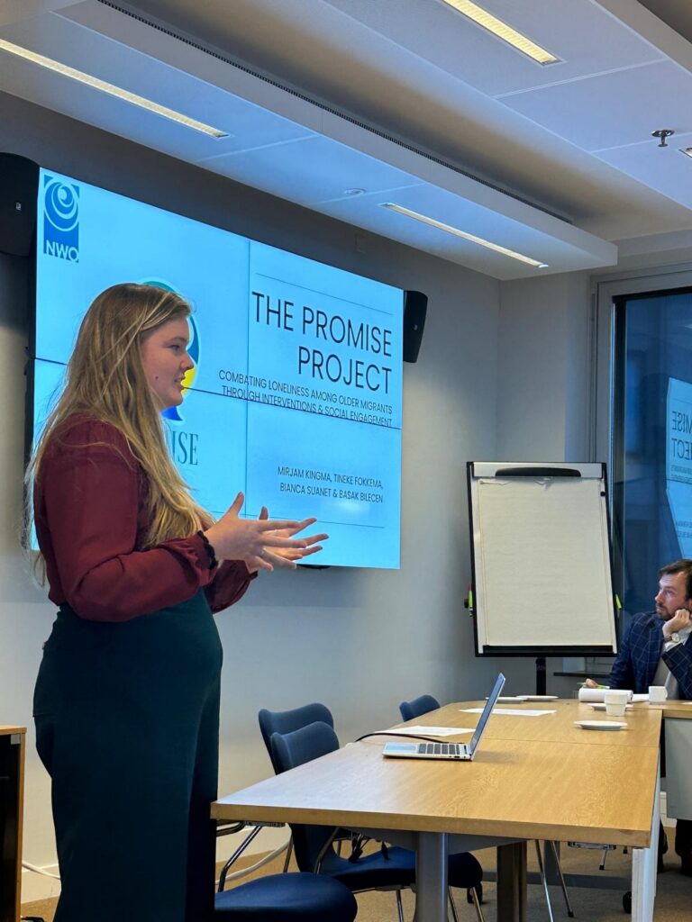 Verleden week nam Mirjam Kingma, samen met Basak Bilecen, Tineke Fokkema, en Bianca Suanet deel aan de Pitch & Mix-bijeenkomst bij het Ministerie van Justitie en Veiligheid. Tijdens haar presentatie deelde zij haar onderzoek naar het gebruik van sociale netwerken in eenzaamheidsinterventies onder oudere migranten. Mirjam benadrukte het belang van de kwaliteit van sociale contacten en het onderling bespreken van verwachtingen voor het verminderen van eenzaamheid binnen deze doelgroep. Na afloop stelden beleidsmedewerkers en wetenschappers inhoudelijke vragen over de toepasbaarheid van haar bevindingen in de praktijk. Het was een bijeenkomst die laat zien hoe wetenschappelijk onderzoek en beleid elkaar kunnen versterken.